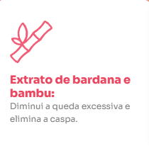 “O kit contém ativos efetivos para o tratamento. Os ativos são: biotina, extrato de bardana, extrato de bambu, queratina hidrolisada, extrato de café, óleo de rícino e pantenol”.